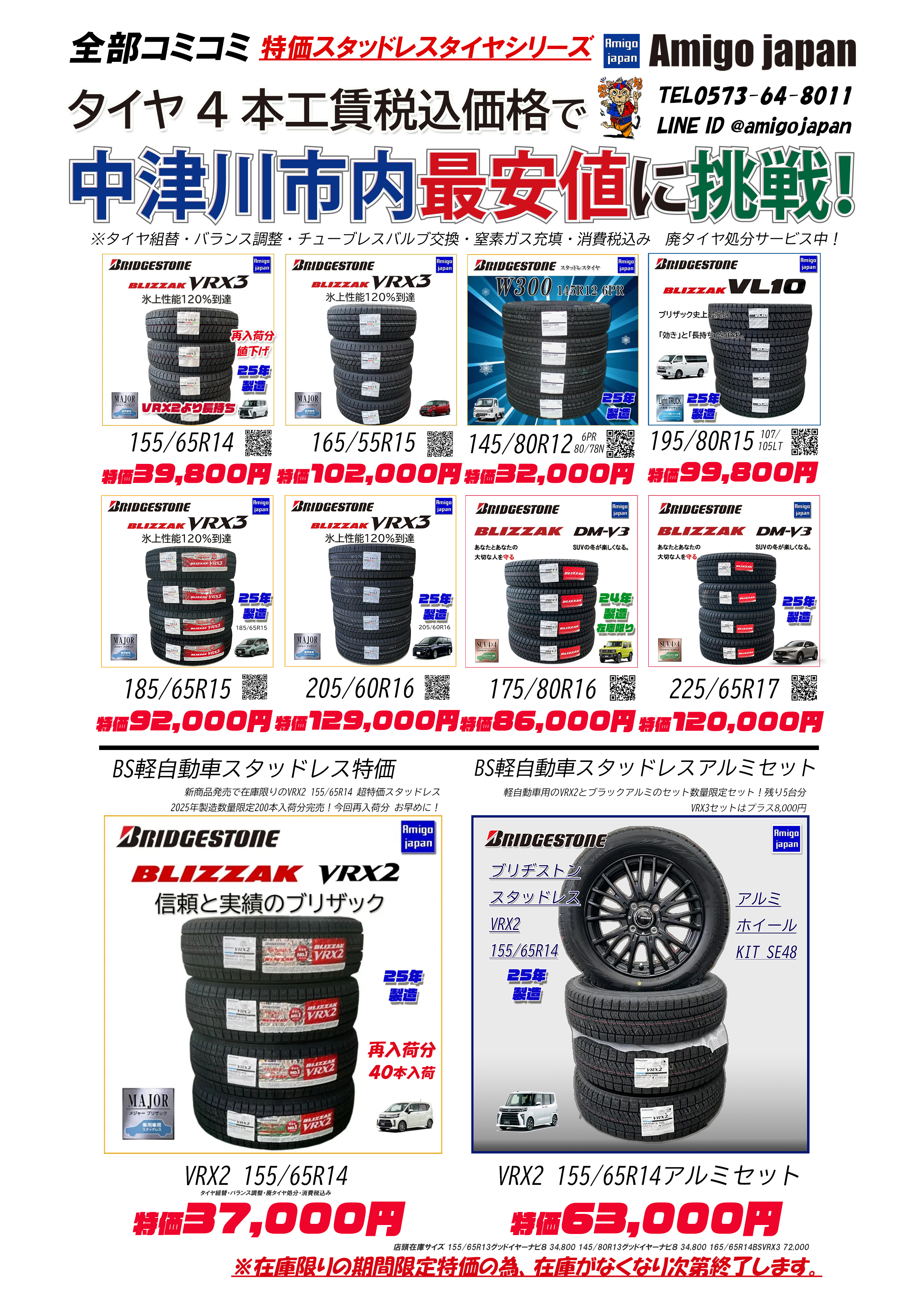 ブリヂストンスタッドレス価格表2025 岐阜県中津川市